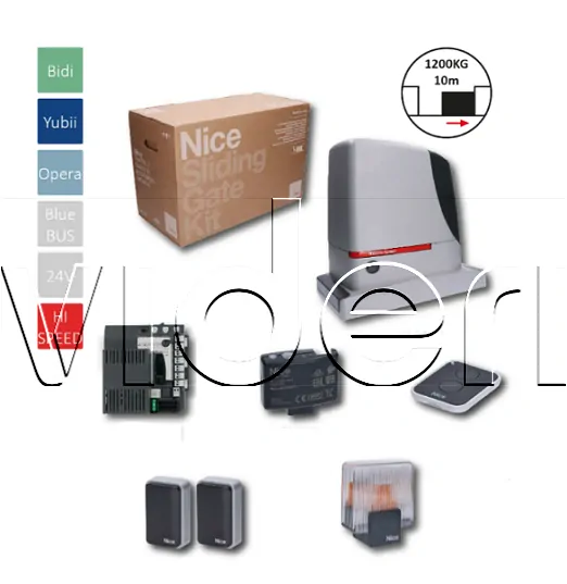 NICE rýchly pohon pre posuvnú bránu do 1200kg, vr. riadiacej elektroniky, majáka, páru fotobuniek, prijímača a 1 ks vysielača (kompatibilný s nabíjačkou batérií a akumulátormi)