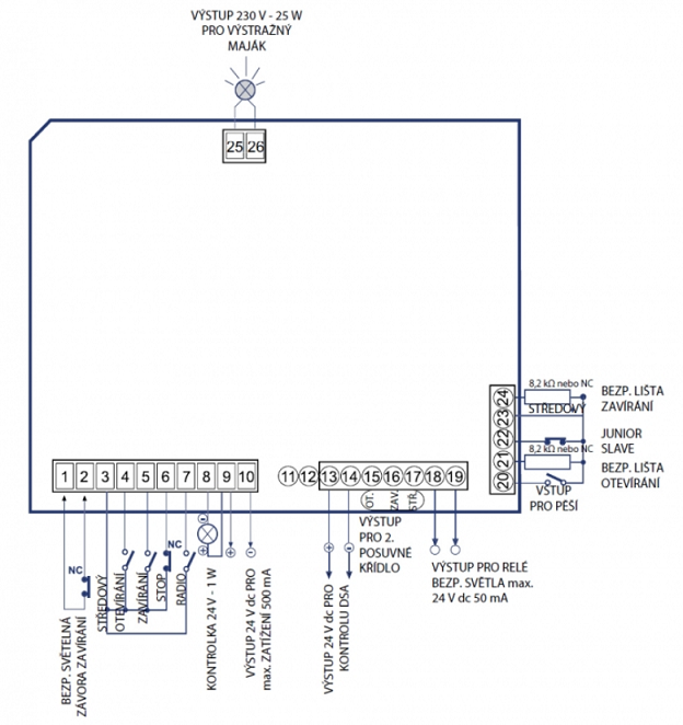 | Výstup fotobuniek/spínača/rádio. prijímača | 24 V dc max. 500 mA | [V dc - mA] |