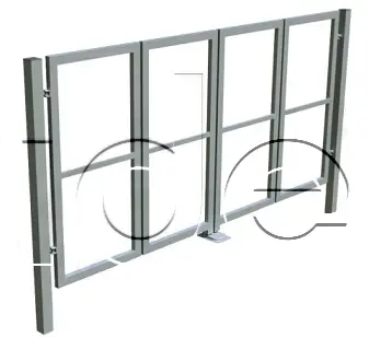 Dvojkrídlová skladacia brána vrátane stĺpikov na zabetónovanie (alebo so základňou na naskrutkovanie), regulovateľné pánty.