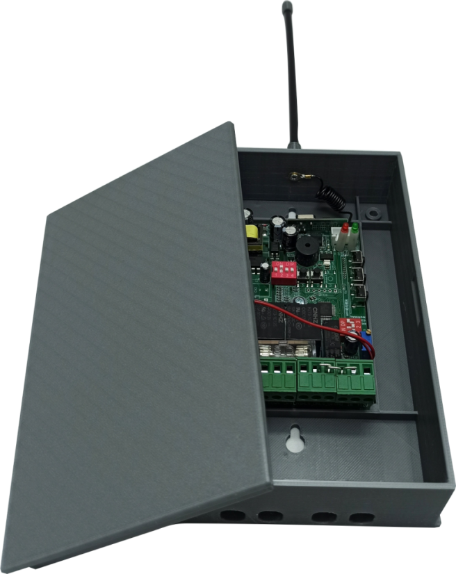 Riadiaca jednotka je umiestnená v plastovej krabici s externou anténou a integrovanými príchytkami pre vodiče, a otvormi pre jednoduchú montáž.